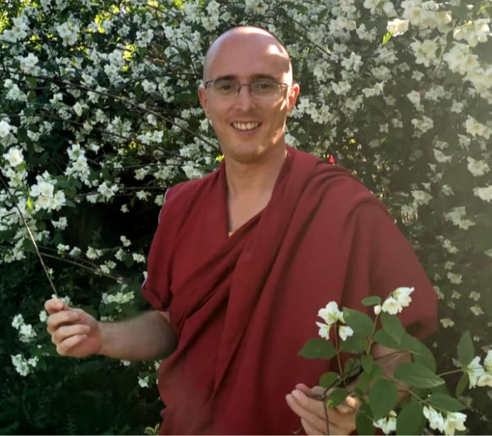 Il découvre le bouddhisme mahayana au centre Kalachakra en 2002, et c’est une révélation puisqu’il va progressivement y consacrer sa vie. Après avoir étudié un an à l'institut Vajra Yogini, il suit le PEBA en résidentiel pendant cinq ans au monastère de Nalanda et devient certifié de la FPMT. C’est durant cette période qu’il prend les vœux monastiques, en 2010. Après trois mois de retraite à Saint Cosme pour valider le PEBA, il retourne à Nalanda pour en devenir directeur et suivre le Master Program, le cursus d 'études le plus avancé de la FPMT, calqué sur l'éducation traditionnelle monastique du Tibet. Il en est maintenant diplômé et est dans sa quatrième année de retraite spirituelle à Saint Cosme. Il enseigne régulièrement pour le centre, en particulier Découverte du bouddhisme ou Explorer le bouddhisme. Il guide aussi des retraites à Saint Cosme, notamment celles portant sur le lamrim ou le Nyoung-né. Très humble, il est apprécié pour sa grande gentillesse, sa profonde connaissance du dharma et sa grande humilité.