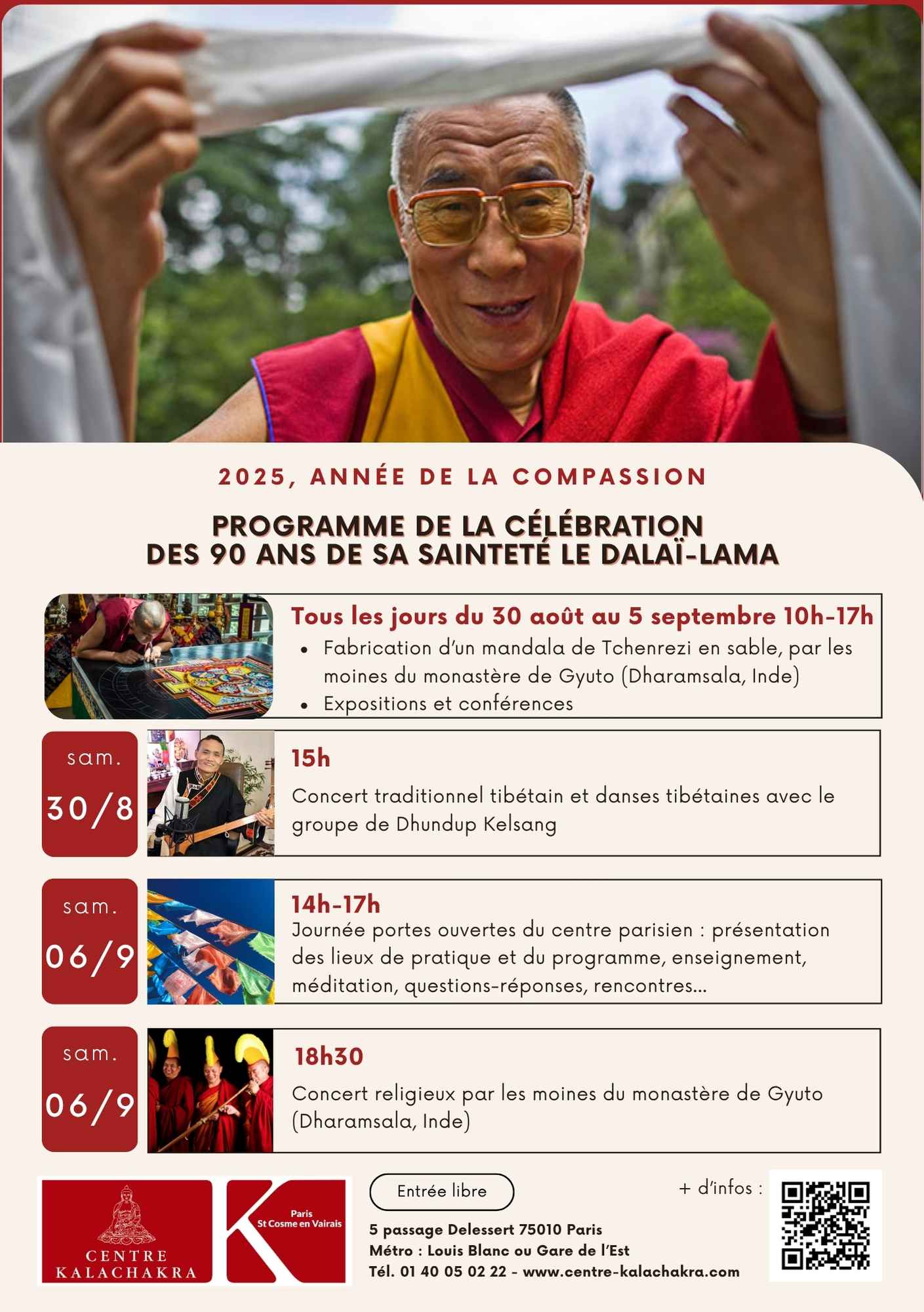 À l’occasion des 90 ans de Sa Sainteté le Dalaï-Lama et de l’année de la compassion 2025, le centre Kalachakra se mobilise lors d’une semaine de pré-rentrée exceptionnelle. Découvrez le programme ci-dessous. Nous vous attendons nombreux !