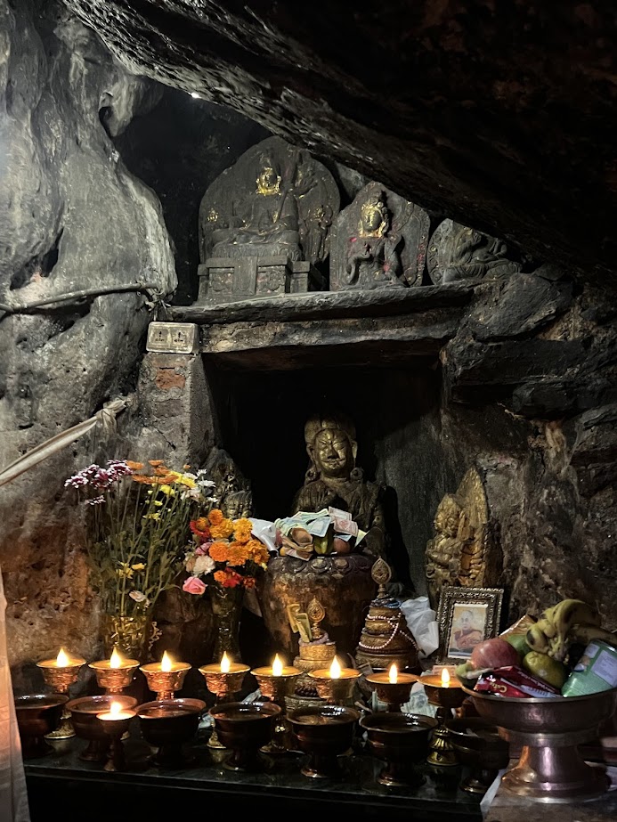 Il y a deux grottes où Gourou Rinpoché se retira pour méditer, la grotte dite « du bas », plus touristique, et la grotte haute, dite « Asura », sur les hauteurs au-dessus du village. On y arrive après une infinité d’escaliers dont on ne voit jamais la fin, et au détour d’un tournant l’on trouve une série de constructions perchées à même le rocher, avec un sentier pavé serpentant le long de la roche et qui conduit à la grotte, à laquelle on accède par une porte taillée dans la pierre avec un encadrement en bois sombre. Au-dessus, fougères innombrables et autres plantes luxuriantes surplombent l’entrée.