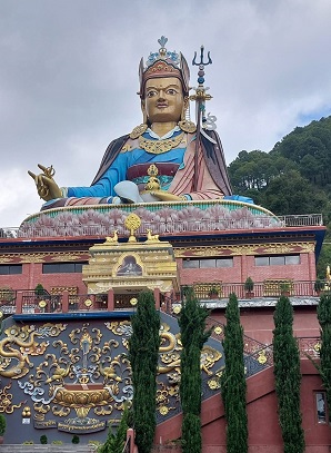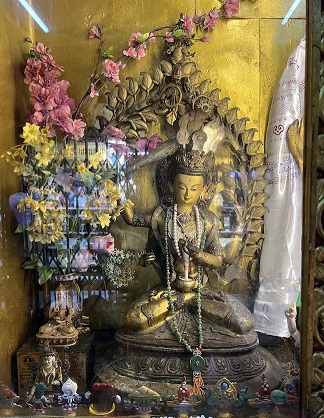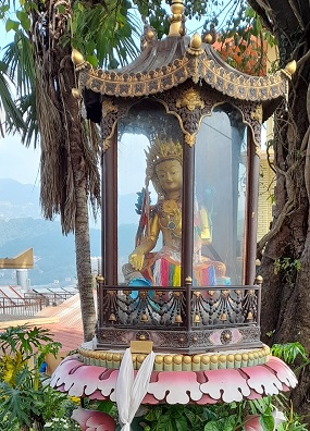 – Vénérable Sarah, une amie de Vénérable Elisabeth, a été notre guide bien souvent pendant ce pèlerinage. Sa ferveur joyeuse et infatigable était très inspirante et nous avons grâce à elle découvert des lieux qu’à coup sûr nous aurions ignorés sinon. Comme par exemple une statue de Tchènrezi érigée au lieu même où il a transmis la pratique du Nyoung-Né à Gelongma Palmo. Un lieu vibrant où j’ai eu envie de prier pour Vénérable Gyaltsen qui nous fait bénéficier de cette pratique à St Cosme.