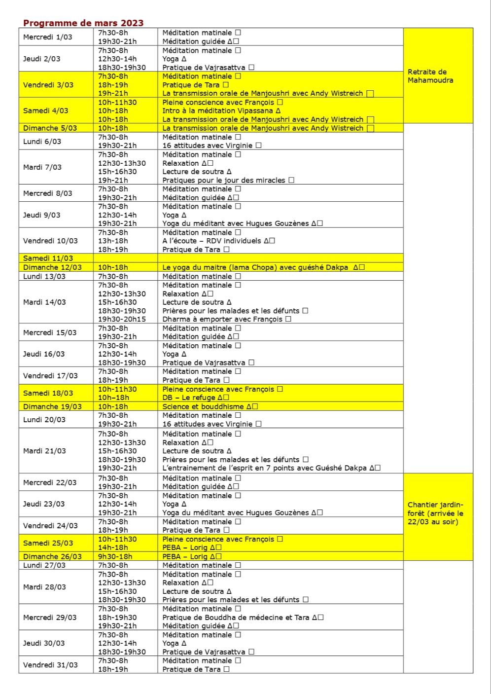 - Initiation à la pleine conscience avec François pendant 5 samedi à partir du 4 mars. C'est un nouveau programme de la FPMT que François va présenter. Il propose une introduction à la pleine conscience et aux diverses techniques méditatives servant à la développer dans la tradition de lama Tsongkhapa. Plus d'informations et inscription ici : https://centre-kalachakra.com/event/introduction-a-la-pleine-conscience-2023-03-04-1332/register