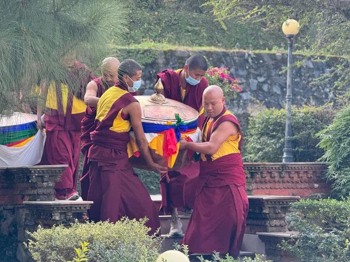 Le 29 novembre 2024, neuf grands vases de trésor d’une largeur de 90 cm chacun, ont été placés à l’intérieur du trône du stoupa. Des substances précieuses et des textes sacrés ont été consacrés avec des prières spéciales, puis les vases en ont été remplis.