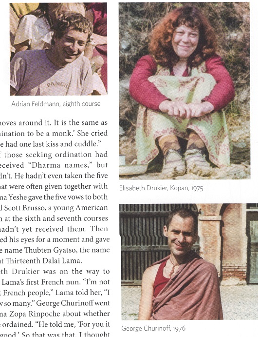Élisabeth Drukier se préparait à devenir la première moniale française de Lama. « Je ne fais pas trop confiance aux français, lui dit-il. Bon, je n’en connais pas tant que ça ! » George Churinoff alla trouver Lama Zopa Rinpoché concernant son éventuelle ordination. « Il me dit : « Pour toi, ce serait positif. » Je pensais que devenir moine était vraiment la seule voie pour que je puisse pratiquer le Dharma et je n’avais aucun engagement relationnel. »