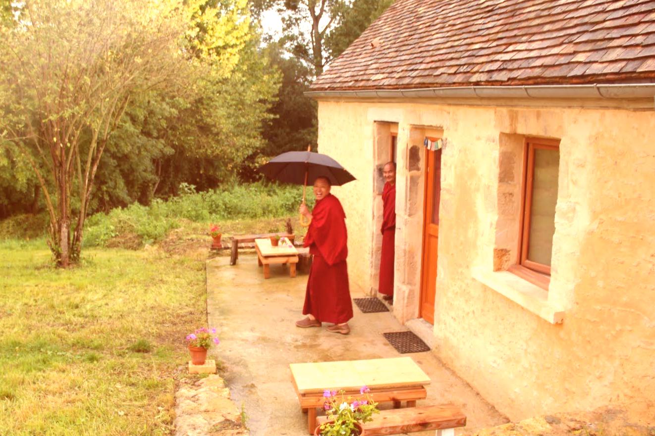 Crise de fous rires entre Guéshé-la et un coreligionnaire à la sortie du bâtiment Milarepa de Saint Cosme.