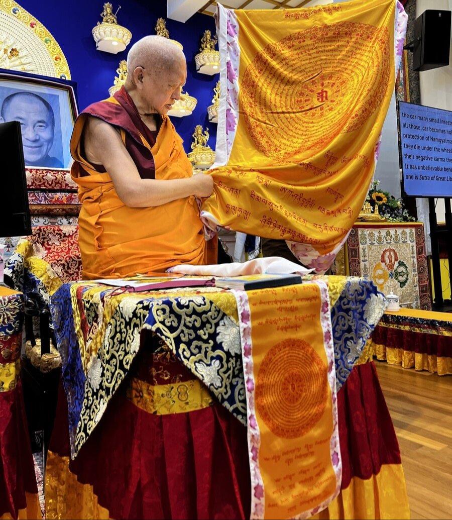 Lors de ses enseignements du 9 avril 2020 sur les Quatre Causes de l’Ignorance et les quatre mantras nommés “Dharmakaya Relic Heart Mantras”, Lama Zopa Rinpoché a recommandé que tous les projets, services, groupes d’étude et centres de la FPMT détiennent des tissus spéciaux, couverts de mantras bénéfiques, à mettre à disposition des étudiants, de leurs amis et de leur famille au moment de la mort.