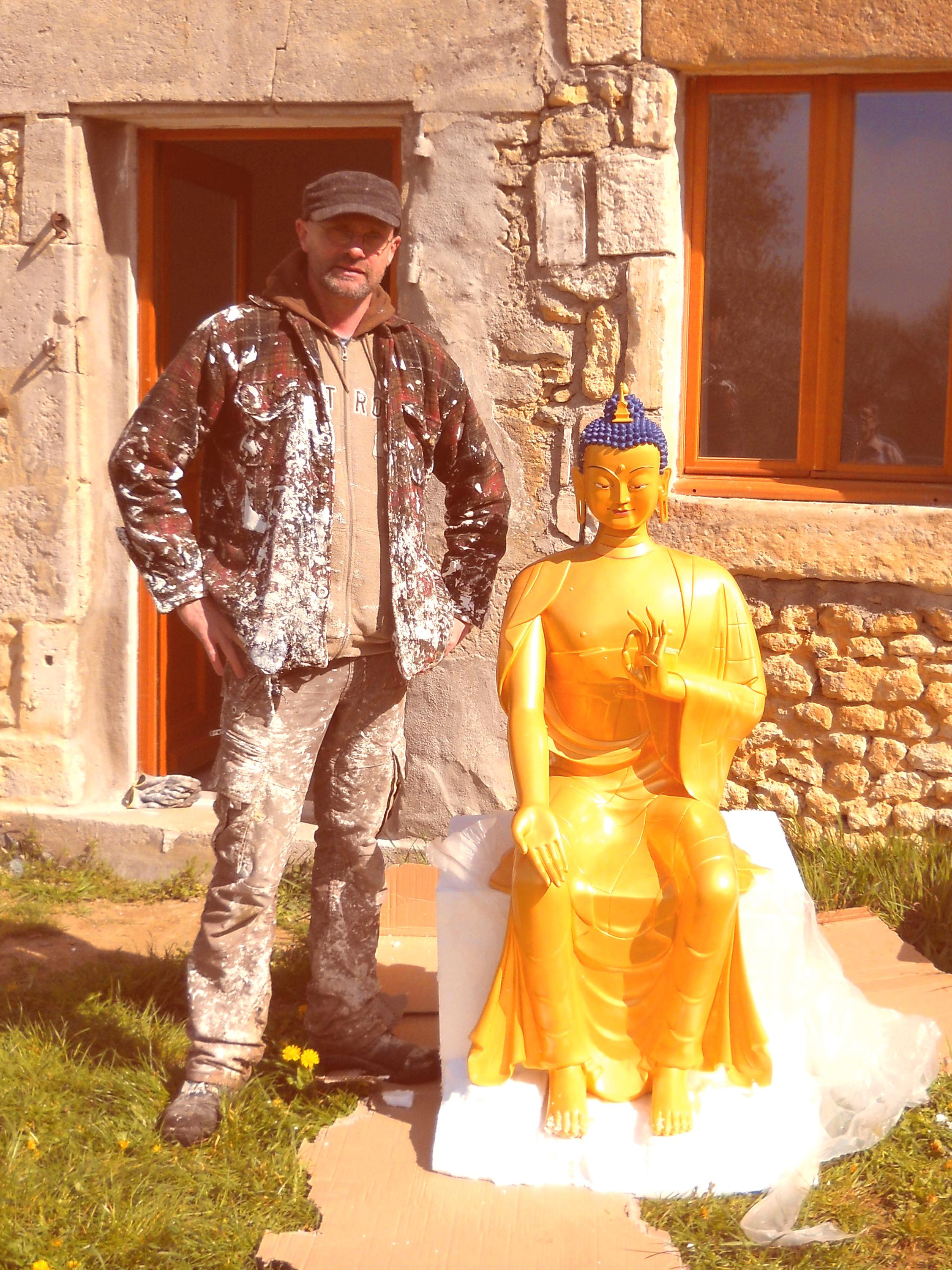 Le contraste est saisissant entre l'aspect immaculé du Bouddha et l'apparence un peu... "laborieuse" d'Edwards, un des bénévoles qui l'a installée !