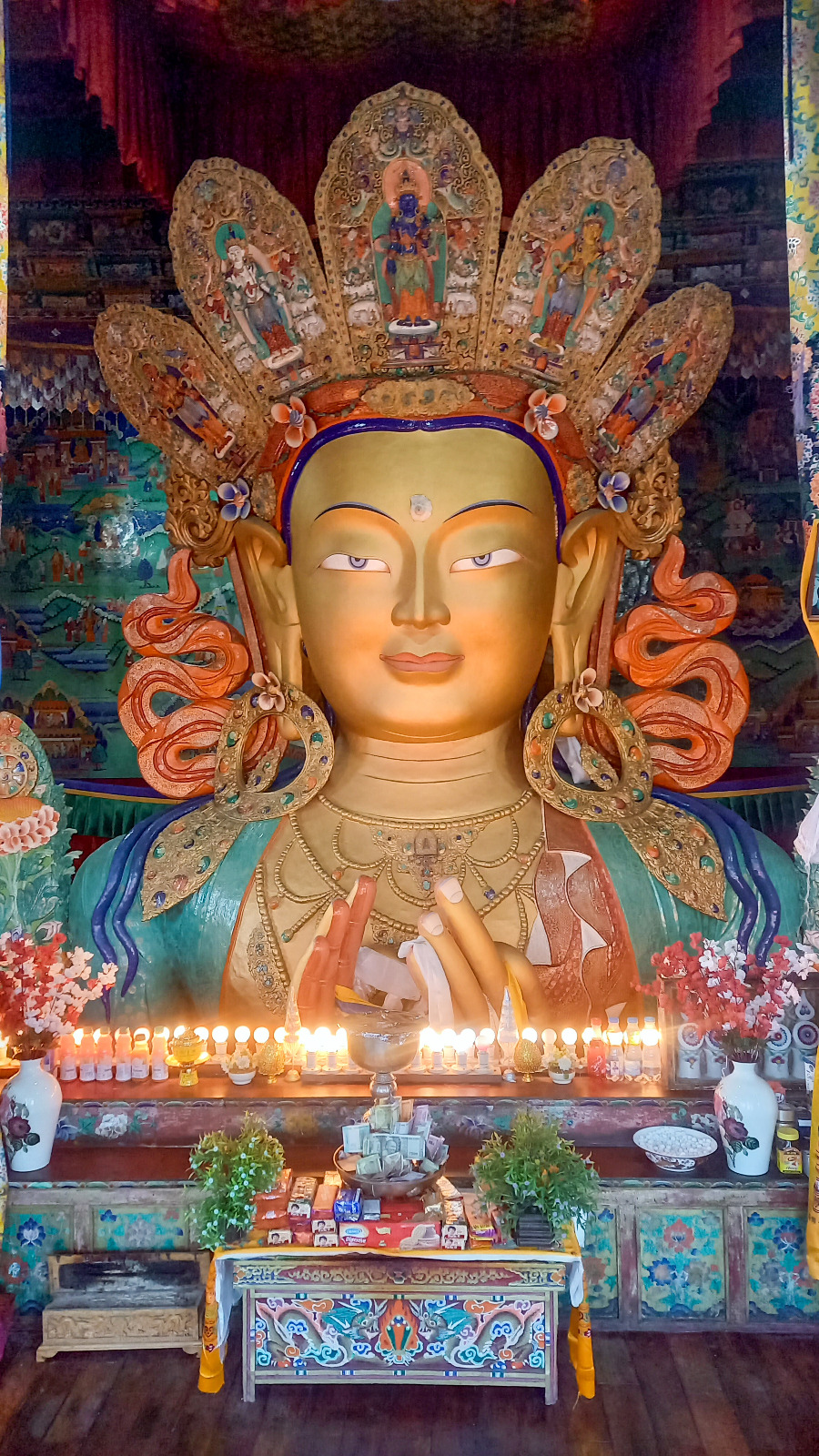 En face de moi, une statue géante du Bouddha, source d'inspiration, manifestation de qualités supérieures, immenses. Un moine arrive et fait tourner un grand cylindre de prières, on entend à peine la cloche qui sonne.